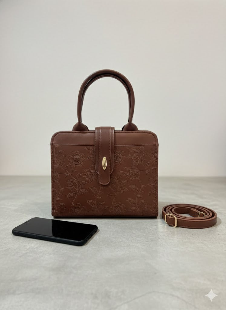 Elevate your accessory collection with this meticulously crafted Floral Stitch Handbag. The striking design features intricate floral embroidery across the front, turning a simple bag into a conversation starter. Constructed from premium, eco-friendly vegan leather, the bag boasts both durability and a soft, supple texture. Functionality is paramount: the spacious, fully-lined interior provides ample room for your tablet, cosmetics, wallet, and more, while internal pockets help keep smaller items organized. With sturdy top handles for comfortable carrying and a secure full-zip closure, this elegant tote ensures your belongings are always safe. Whether you're dressing up for a special event or adding a touch of romance to your everyday look, this embroidered bag is the perfect luxurious finishing touch.