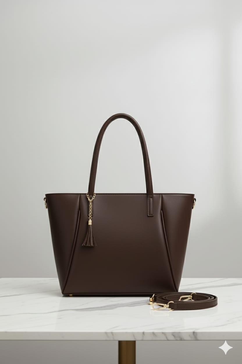 Step out in timeless elegance with the LuxeTan Leat,her Tote crafted from premium smooth leather in a rich caramel hue. Its sleek design pairs effortlessly with both casual and formal outfits, while the spacious interior keeps your essentials perfectly organized. The detachable strap offers versatile carry options — from chic shoulder wear to a classy hand-carry look. Finished with a stylish tassel charm and gold-tone hardware, this tote is your go-to for everyday sophistication.